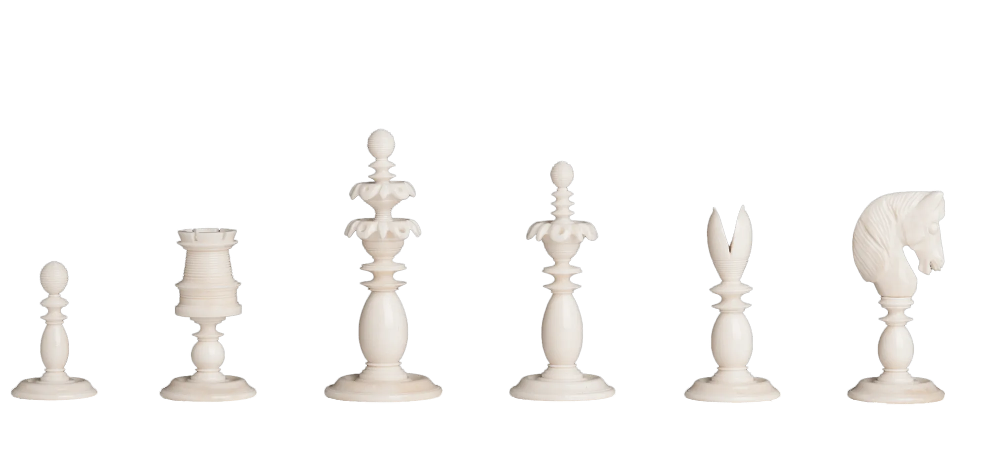 This elaborate early 1800s English Playing Chess Set design, referred to in the literature as a Calvert Pattern, is derived from earlier German designs from the 15th through the 19th centuries. It is often, but wrongly, attributed to John Calvert, a Master of the Worshipful Company of Turners, located at 189 Fleet Street, from around 1790 to 1840. He specialized in exquisitely turned Chess sets for the aristocracy and for the many coffee shops and clubs where Chess was a popular pastime.
