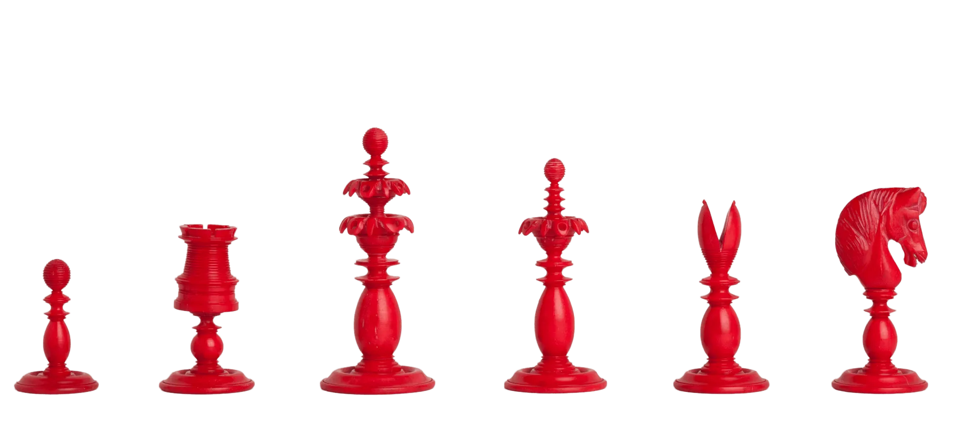Chessmen of this type were actually manufactured throughout the early-to-mid Victorian period by John Jaques of London and Thomas Lund of Cornhill. The Calvert playing sets were ultimately supplanted by the Staunton pattern chessmen, which were introduced to the public in the fall of 1849 by the firm of John Jaques of London. The pattern dates from 1815, at which time White and red colored pieces were popular. The slender baluster stems and the unusual form of the King and Queen with their pierced floral crowns, makes an attractive and highly decorative design.