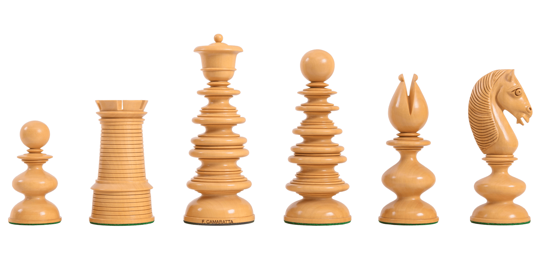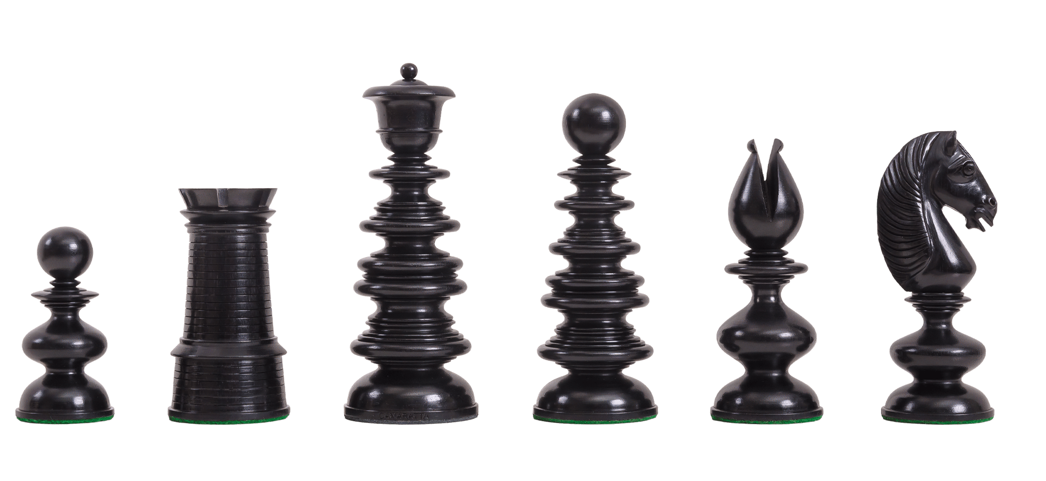 The House of Staunton is honored to present The Calvert Luxury Chess Pieces, a magnificent Full Club Size reproduction of the revered John Calvert Chessmen. Expertly crafted from the finest Boxwood and Ebony, this extraordinary set faithfully captures the refined aesthetics and dignified presence of the originals, which were prominent throughout the late Georgian Period and are believed to date to the 1820s. The King rises to a commanding 4-1/2" height with a 1-6/8" diameter base, offering a bold, stately silhouette that immediately distinguishes this set among the most impressive Pre-Staunton designs.