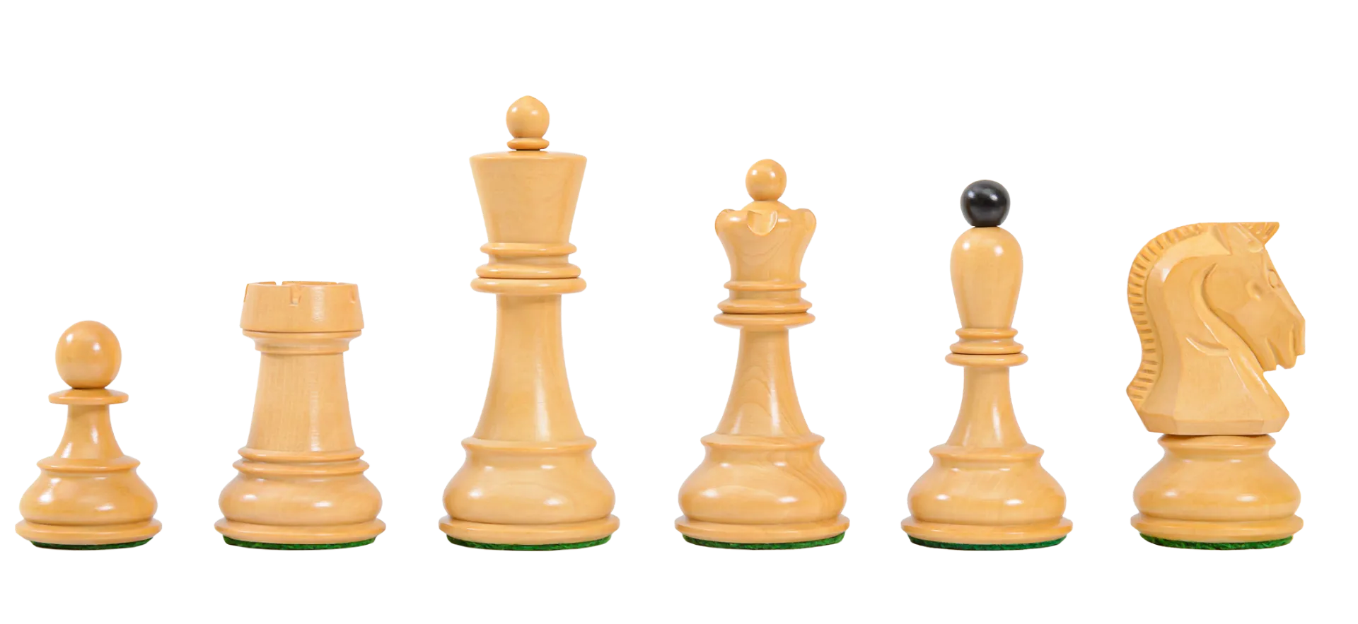 It is well known that Bobby Fischer ranked the 1950 and the later 1960 Dubrovnik set, designed by Andrija Maurović, Chessmen as the best set of chess pieces for serious play and analysis. He often heaped lavish praise upon them. However, exactly which Dubrovnik pieces was Fischer referencing? Well, there were actually (at least) two versions. However, the actual 1960 Dubrovnik set often pictured with Bobby and preferred by him, has not heretofore been reproduced. Now, The House of Staunton has changed all that. Using pieces from an actual 1960s set, a precise recreation of Fischer’s favorite set has been made - the new House of Staunton Fischer-Dubrovnik Chessmen. The King stands 3-5/8“tall with a 1-1/2” diameter base. Each of the pieces rests atop green baize base pads. One design feature of these Dubrovnik Staunton chessmen is the lack of Religious adornments. The Christian Formeé cross has been replaced with a simple ball finial and the traditional Bishop’s miter has been eliminated. The only accommodation made to current praxis is the addition of ballast to the pieces for increased stability. The originals were unweighted. A comparison of The House of Staunton recreation with the Original 1960 Dubrovnik is shown here.