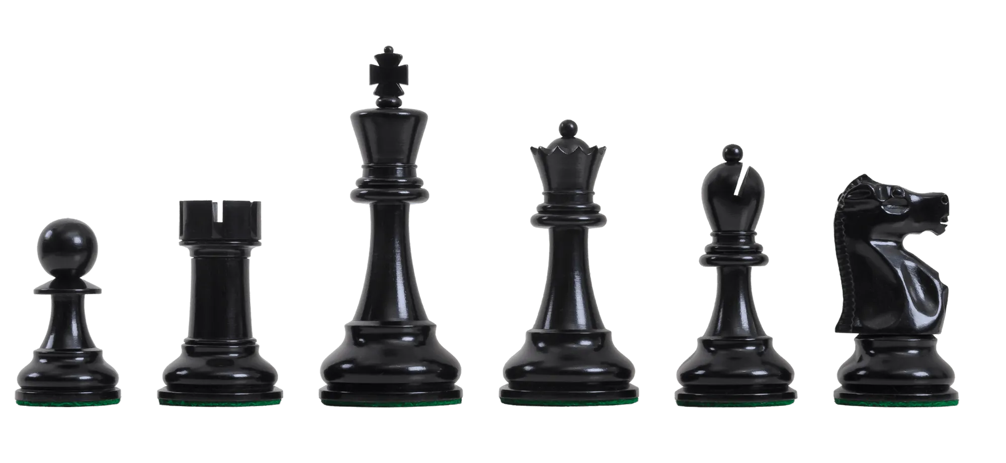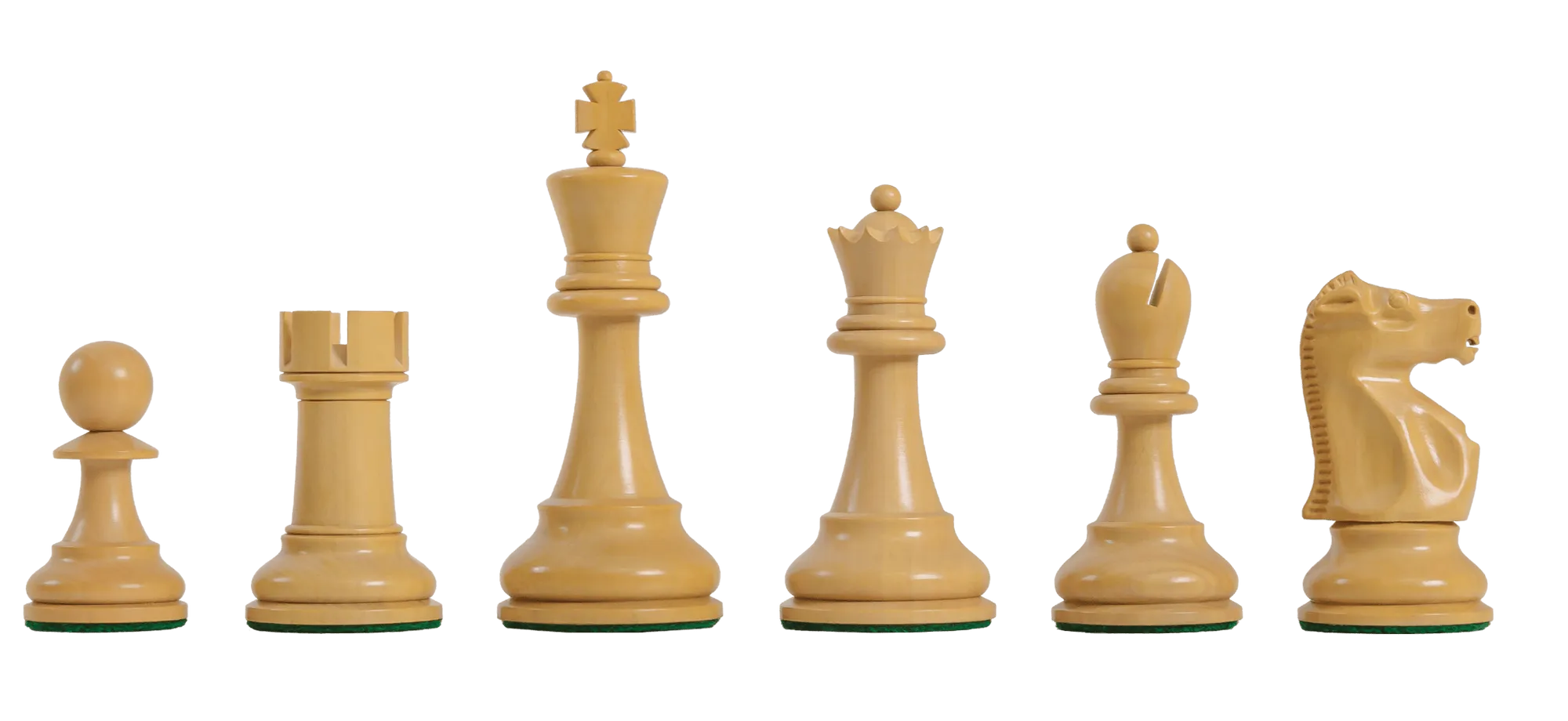 The Fischer Series Chess set features a 4.4" King with a 1.75" diameter base and is heavily weighted. The Chess pieces are hand carved by our master artisans and crafted out of the highest grade Boxwood and Genuine Ebony and are heavily weighted with gold embossed English Leather base pads under the Kings and luxurious billiard cloth base pads on the other Chess pieces.