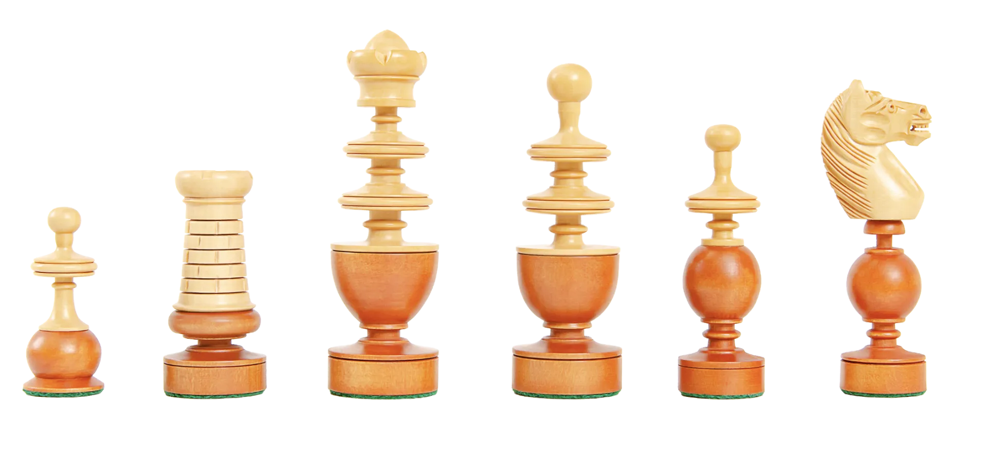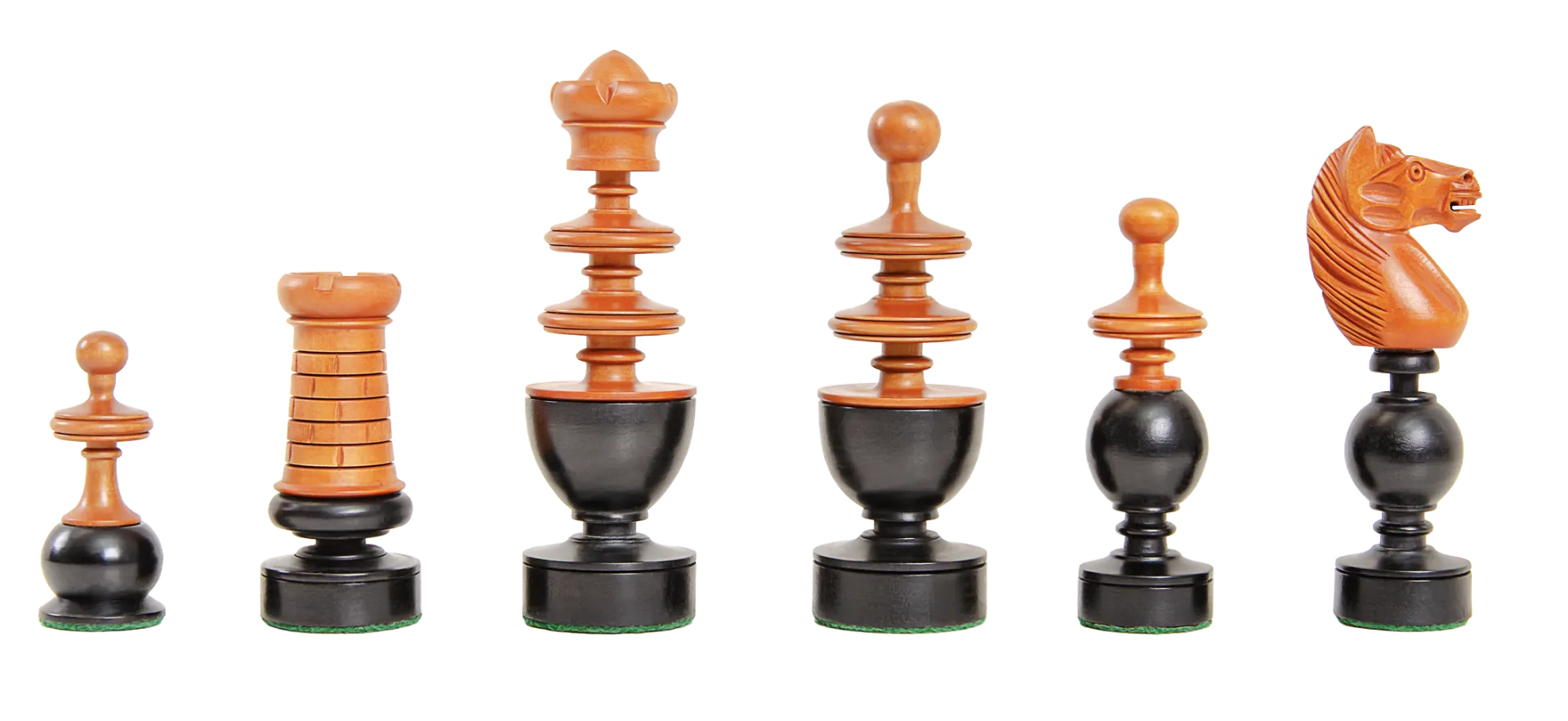 "Crafted to replicate the design and proportions of the original French Regence Chessmen, these chess pieces are named after the Café de la Régence in Paris. Widely considered the chess Mecca throughout the 17th and 18th centuries, it was frequented by such chess luminaries as Philidor, Saint-Amant, Morphy, Anderssen and even Howard Staunton."