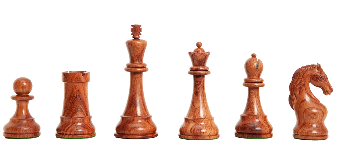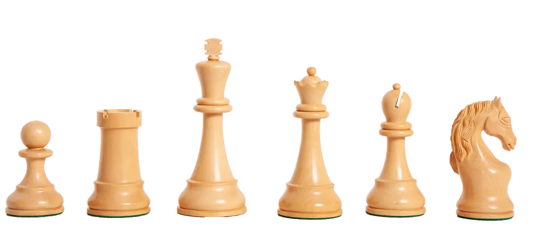 The House of Staunton is proud to offer the Herman Steiner Commemorative Series Chess Pieces. It features a 5.0" King with a 2.0" diameter base. The Chess pieces are hand carved by our master artisans and crafted out of the finest woods. The Chess pieces are heavily weighted with English Leather basepads stamped with Frank Camaratta Signature under the King, luxurious billiard cloth base pads under the other pieces and a beautiful finish.