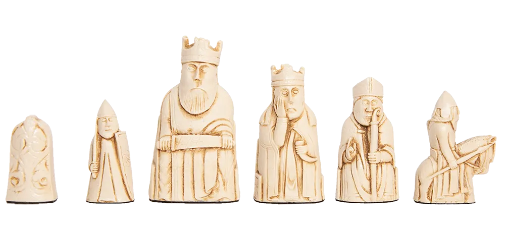 These chess pieces are replicas of the originals which were discovered on the Isle of Lewis off the West Coast of Scotland and which are now housed safely and securely in the British Museum of London and in Edinburgh. Many pieces were discovered and this is our interpretation of the Isle of Lewis chess set. The Isle of Lewis chessmen were featured in the movie, Harry Potter and the Sorcerer's Stone.