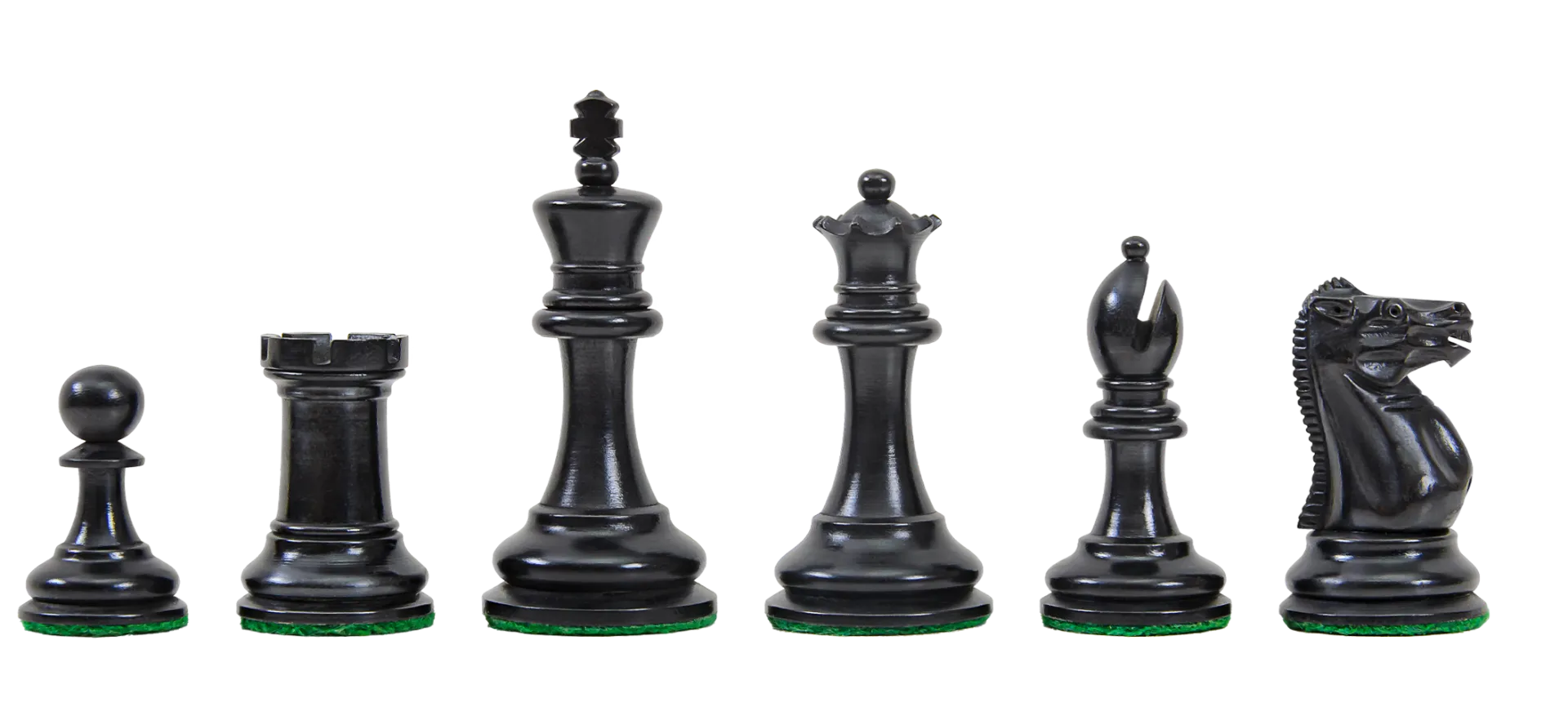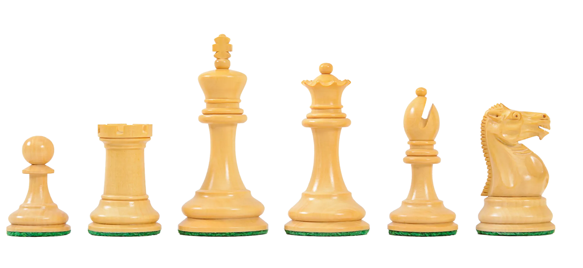 The chess pieces are Antiqued Boxwood and Genuine Ebony. The King stands 2.875”″ tall with a 1-3/8″ diameter base. This is often referred to as the “Library Collection.” The Chess pieces are heavily weighted with luxurious billiard cloth base pads and a beautiful finish.